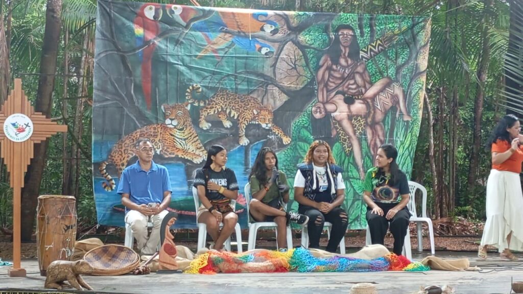 No palco principal falaram lideranças indígenas, mulheres, jovens e anciãos sobre temas como território, clima, juventude e saberes ancestrais. A cruz do Jubileu da Esperança, redes indígenas e uma imagem de uma mulher grávida compuseram o cenário.