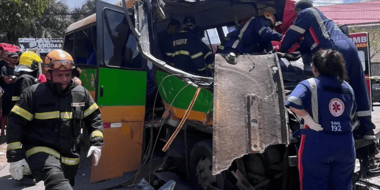 A colisão envolveu um micro-ônibus do transporte alternativo — conhecido como “amarelinho” — e um caminhão caçamba que descarregava areia. Ao menos 12 pessoas ficaram feridas, entre elas crianças e uma idosa.
