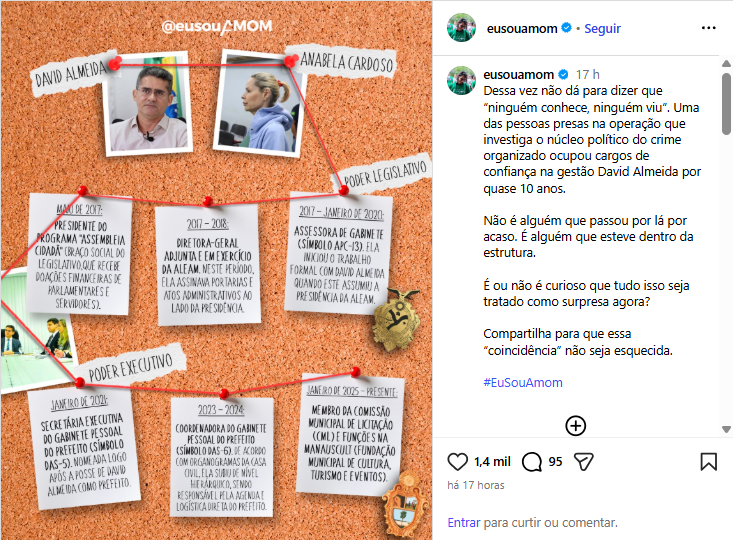A imagem divulgada apresenta uma espécie de linha do tempo organizada em um mural, com fotografias de David Almeida e Anabela Cardoso conectadas por fios, sugerindo uma relação contínua ao longo de quase uma década. A postagem afirma que uma das pessoas presas em uma operação que investiga o núcleo político do crime organizado ocupou cargos de confiança na gestão municipal por aproximadamente dez anos.