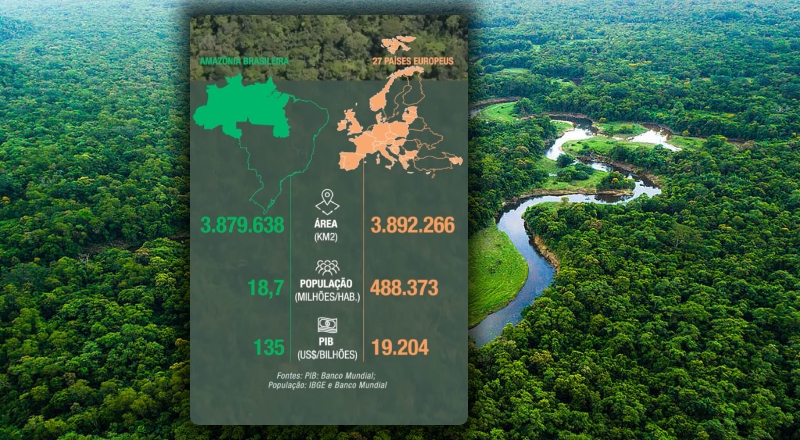 A Amazônia Brasileira ocupa quase 4 milhões de km², o equivalente à soma de 27 países europeus, mas abriga apenas 18,7 milhões de habitantes — contra 489 milhões nas nações do Velho Continente. A diferença mais gritante, porém, é econômica: o PIB amazônico é de US$ 135 bilhões, enquanto o dos países europeus comparáveis ultrapassa US$ 19 trilhões.