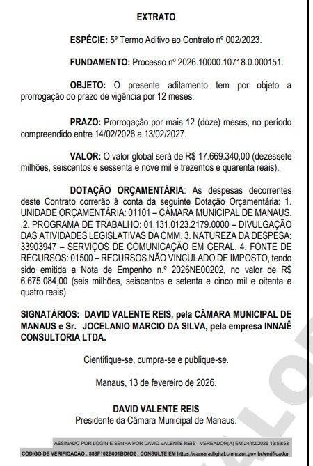 A Câmara Municipal de Manaus (CMM) renovou por mais um ano um contrato milionário com a empresa Innaiê Consultoria Ltda., aprofundando uma relação financeira que já movimenta cifras expressivas dos cofres públicos desde 2023.