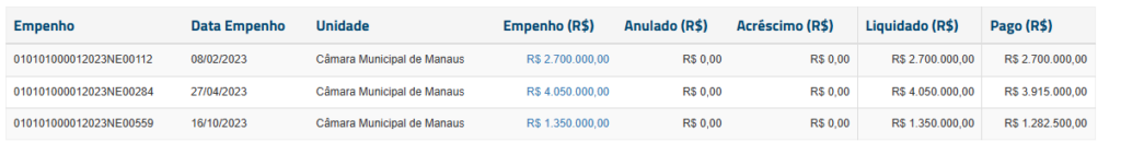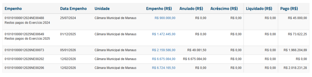 Nos primeiros meses de 2026, antes mesmo da execução completa do novo aditivo, já há empenhos milionários, incluindo registros superiores a R$ 6 milhões.