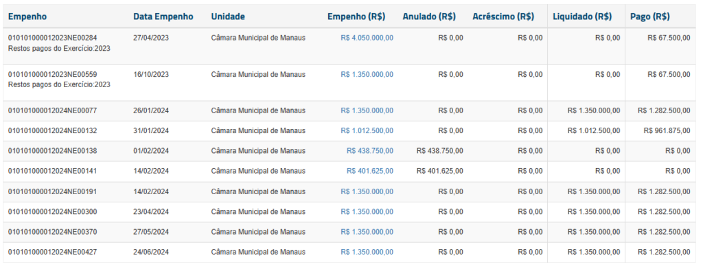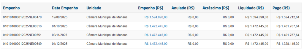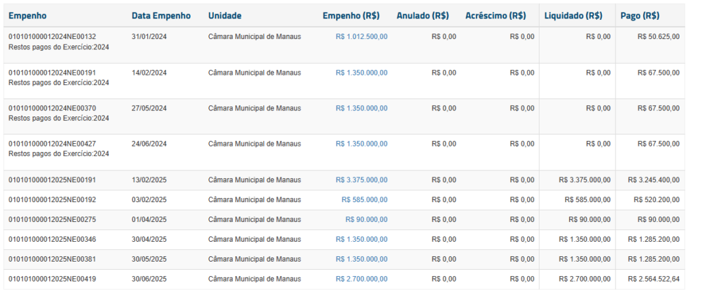 Em 2025, os valores se mantêm elevados, com empenhos que chegam a R$ 3,3 milhões e pagamentos mensais superiores a R$ 1,3 milhão.