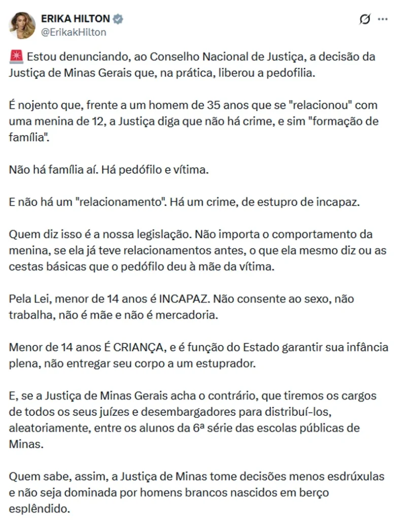 A abertura da apuração no CNJ foi provocada por representação formal apresentada pela deputada federal Erika Hilton, com apoio de outros parlamentares. Na qual foi solicitou que o órgão de controle do Judiciário analisasse a decisão do TJMG sob a perspectiva disciplinar e à luz da jurisprudência consolidada sobre proteção de menores.
