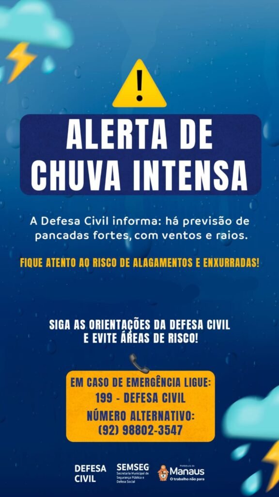 A Prefeitura de Manaus reforça que a população deve seguir as orientações da Defesa Civil e evitar áreas de risco, como encostas e margens de igarapés. Em caso de emergência, o cidadão pode acionar o órgão pelo número 199 ou pelo telefone alternativo (92) 98802-3547.