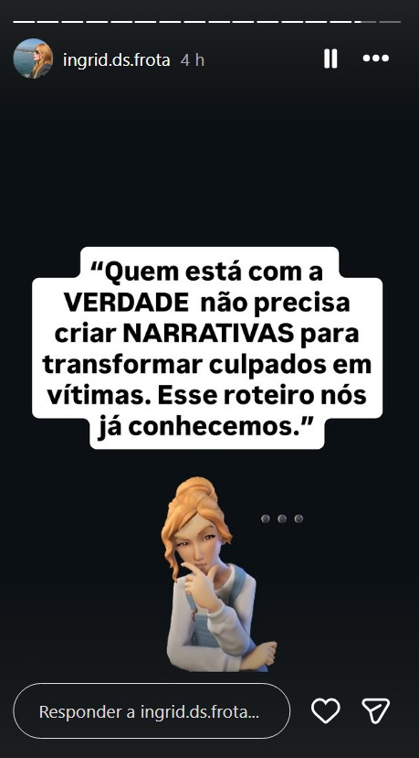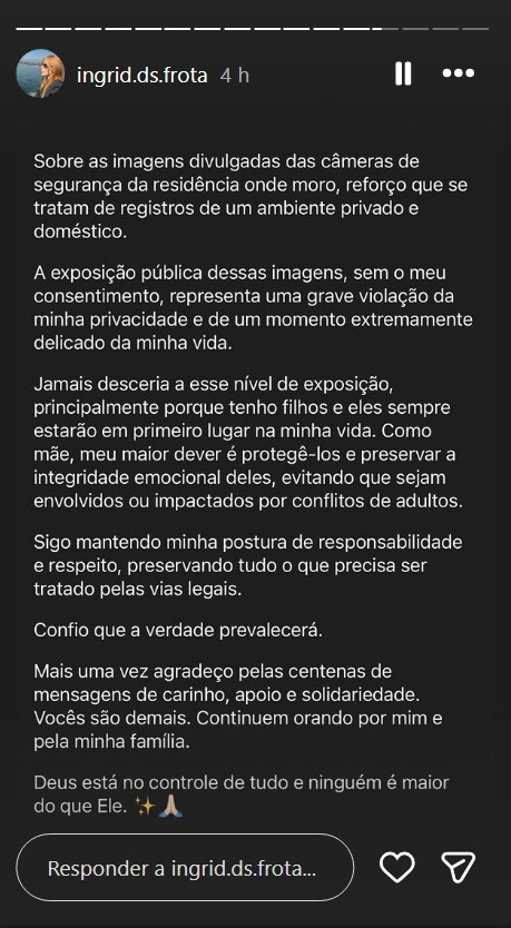 Ingrid também criticou a divulgação de imagens de câmeras de segurança da residência do casal, alegando que os registros foram expostos publicamente sem autorização e que se tratam de imagens de um ambiente privado. Segundo ela, a exposição das gravações representa uma violação de sua privacidade em um momento sensível.