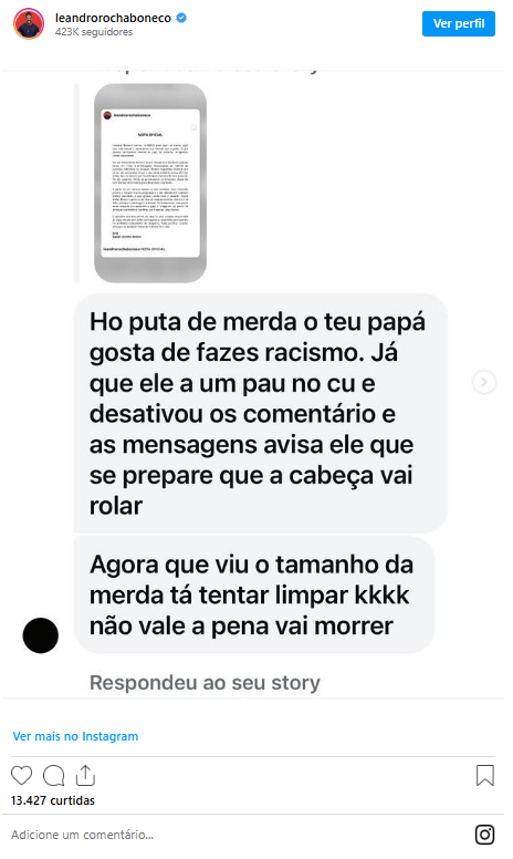Em nota publicada pela equipe do Boneco, como é conhecido na casa, algumas mensagens enviadas ao perfil da menina foram expostas como exemplo do que vem acontecendo desde os últimos embates envolvendo Leandro dentro da casa.