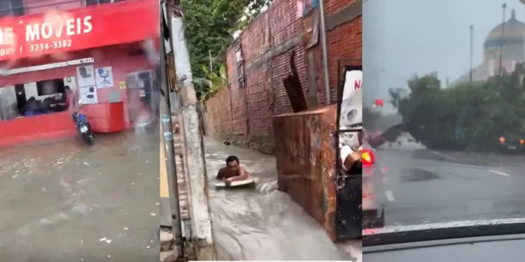 Em diferentes bairros, vídeos registrados por moradores mostram ruas completamente tomadas pela água, veículos submersos e pedestres tentando atravessar alagamentos em áreas como o Centro, Cidade Nova, Compensa e Japiim.