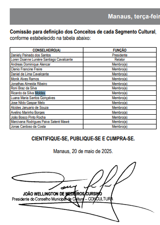A presença de Ricardo da Silva Moldes no Conselho Municipal de Cultura de Manaus não se limita ao decreto de nomeação inicial. Além do Decreto publicado no Diário Oficial do Município, em 12 de março de 2024, que o designa conselheiro para o biênio 2024–2026, o nome de Moldes volta a constar em atos administrativos publicados no Diário Oficial do Município, em 20 de maio de 2025.