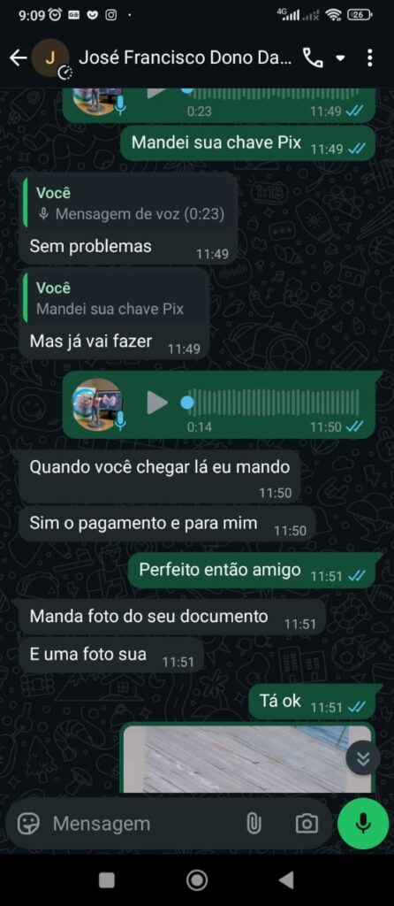 Durante a negociação, o estelionatário pediu que a vítima enviasse uma foto do documento e uma selfie, alegando que precisava confirmar a identidade antes de finalizar a venda. Em seguida, solicitou o pagamento de R$ 900 via Pix, prometendo que o restante seria acertado após a entrega do veículo.