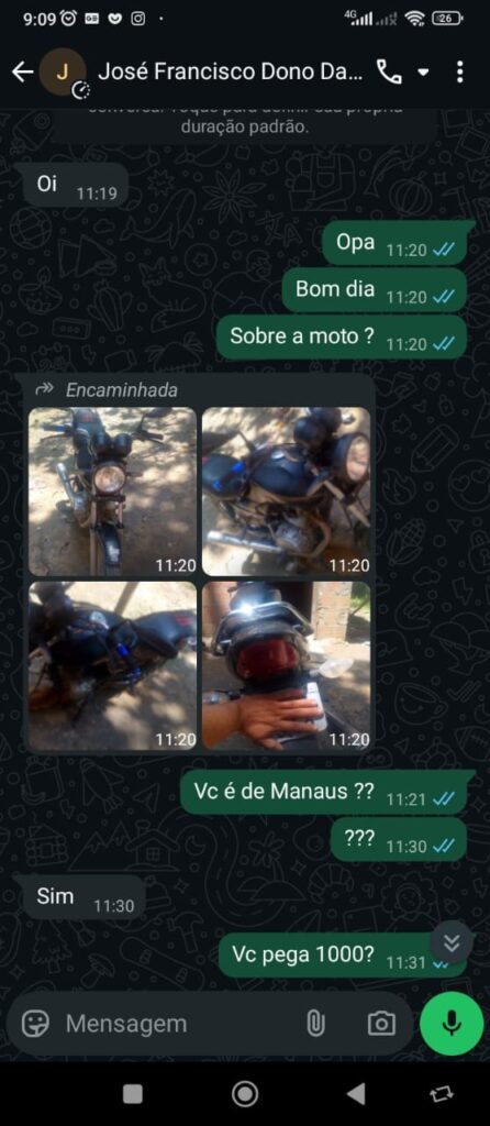 De acordo com o relato da vítima, o anúncio da motocicleta, avaliada em cerca de R$ 5 mil, estava sendo ofertado por R$ 1.500 em um aplicativo de vendas. O preço abaixo do mercado chamou atenção e o homem decidiu entrar em contato com o suposto vendedor. Durante a conversa, o golpista se mostrou educado, convincente e prestativo, enviando fotos da moto com a placa parcialmente coberta para passar credibilidade.