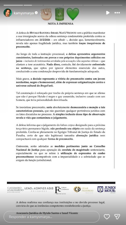 Nas redes sociais, a influenciadora Kamylinha, conhecida por sua proximidade com Hytalo Santos, publicou mensagens de apoio ao casal, classificando a decisão judicial como “injusta” e sugerindo que o processo teria conotações políticas ou perseguição moral. Seu posicionamento gerou numerosas reações — tanto de apoio quanto de críticas — entre seguidores e internautas.