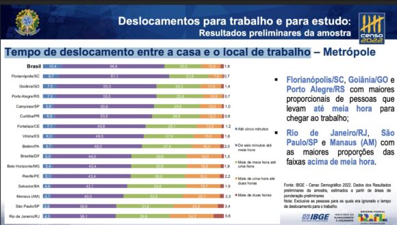 O IBGE considera o tempo gasto entre o domicílio e o local do trabalho principal, desconsiderando paradas intermediárias, como levar filhos à escola ou fazer compras. Nos casos em que o trabalhador sai de outro local, como a faculdade, o tempo considerado é o do retorno para casa. As informações se referem à semana de 25 a 31 de julho de 2022 e abrangem apenas quem se desloca pelo menos três vezes por semana até o trabalho.