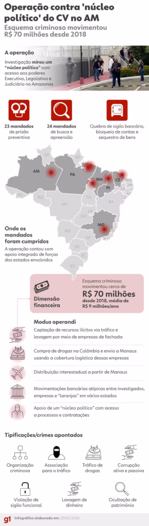 Uma força-tarefa policial deflagrada na manhã desta sexta-feira sacudiu os poderes Executivo, Legislativo e Judiciário no Amazonas. A Operação batizada de Erga Omnes — expressão em latim que significa que a lei “vale para todos” — teve como alvo um grupo investigado por atuar como um núcleo político do Comando Vermelho (CV), a maior facção criminosa em atuação no estado e no país, segundo as autoridades policiais.