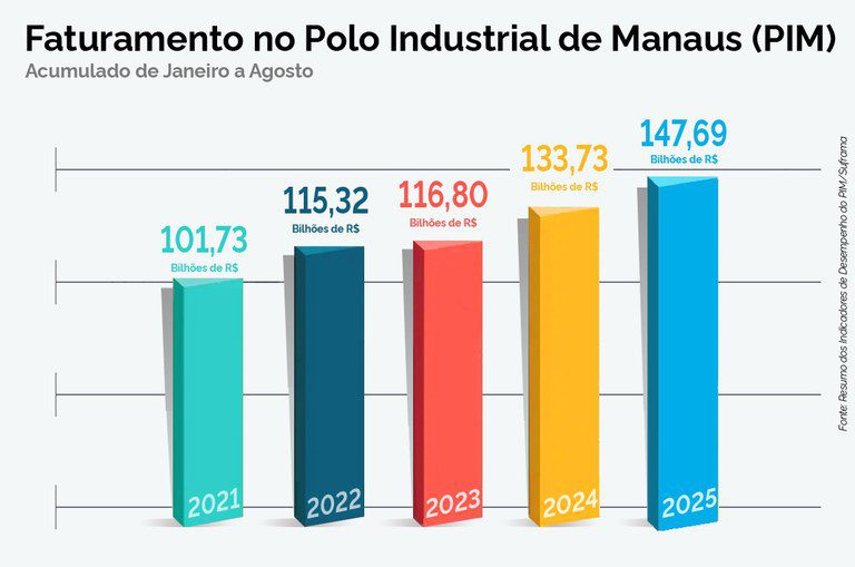 O Polo Industrial de Manaus (PIM) faturou o montante de R$ 147,69 bilhões entre janeiro e agosto de 2025, o que representa aumento de 10,4% em relação ao valor faturado em igual período do ano passado (R$ 133,73 bilhões). Em dólar, o faturamento do PIM nos oito primeiros meses deste ano totalizou US$ 26.11 bilhões.
