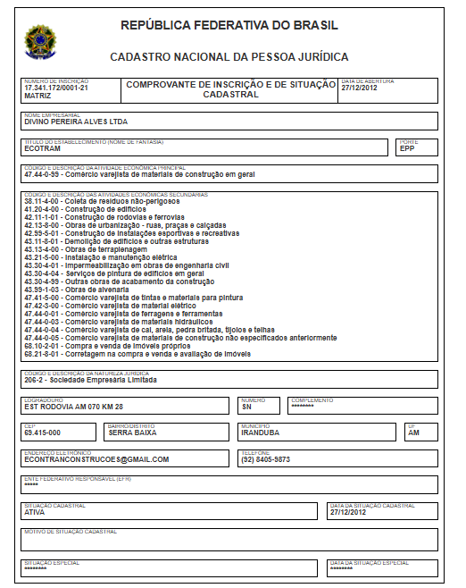 A empresa com razão social Divino Pereira Alves Ltda tem o nome fantasia de Ecotram e opera com CNPJ 17.341.172/0001-21. O endereço de sua sede está localizada na Estrada Rodovia Am 070, Km 28, Iranduba. Sua atividade principal é de Comércio varejista de materiais de construção em geral. A capital social é de R$ 500 mil.