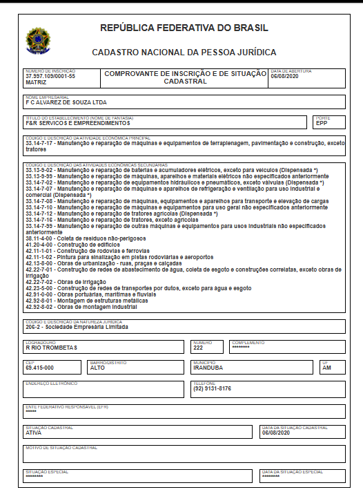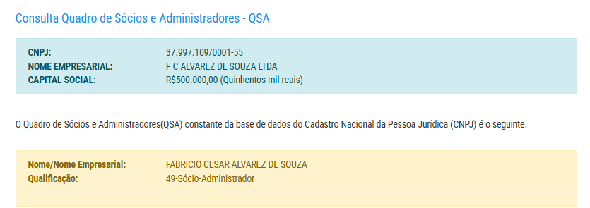 A segunda empresa F C Alvarez de Souza Ltda, tem o nome fantasia F&r Servicos e Empreendimentos, opera com o CNPJ 37.997.109/0001-55 . O endereço de sua sede está localizada na Rua Rio Trombetas, 222, Iranduba. Sua atividade principal é de Manutenção e reparação de máquinas e equipamentos de terraplenagem, pavimentação e construção, exceto tratores. O capital social da empresa é de R$ 500 mil e pertence a Fabricio Cesar Alvarez de Souza.