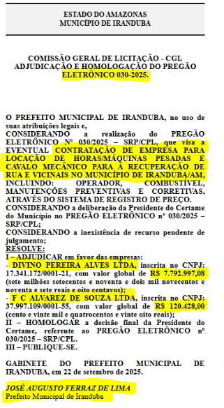 Realizando um show de gastos em Iranduba, o prefeito Augusto Ferraz (União Brasil) vai gastar mais de R$ 7,9 milhões com duas empresas para locação de máquinas pesadas e cavalo mecânico. De acordo com informações apuradas pela reportagem, o Pregão Eletrônico n° 030/2025 é para recuperação de rua e vicinais do município.