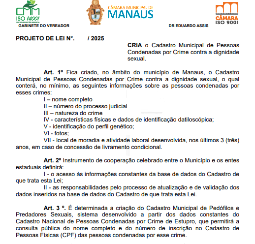 O texto determina, ainda, a criação do Cadastro Municipal de Pedófilos e Predadores Sexuais, sistema que será desenvolvido a partir das informações do Cadastro Nacional de Pessoas Condenadas por Crime de Estupro. Esse banco de dados permitirá a consulta pública do nome completo e do número de CPF das pessoas condenadas por esses crimes.