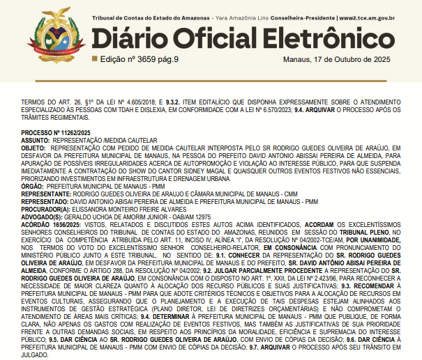 O Tribunal de Contas do Estado do Amazonas (TCE-AM) julgou parcialmente procedente uma representação que questionava os gastos da Prefeitura de Manaus com eventos festivos, como o show do cantor Sidney Magal. A decisão foi publicada no Diário Oficial Eletrônico da Corte na última sexta-feira, 17/10.