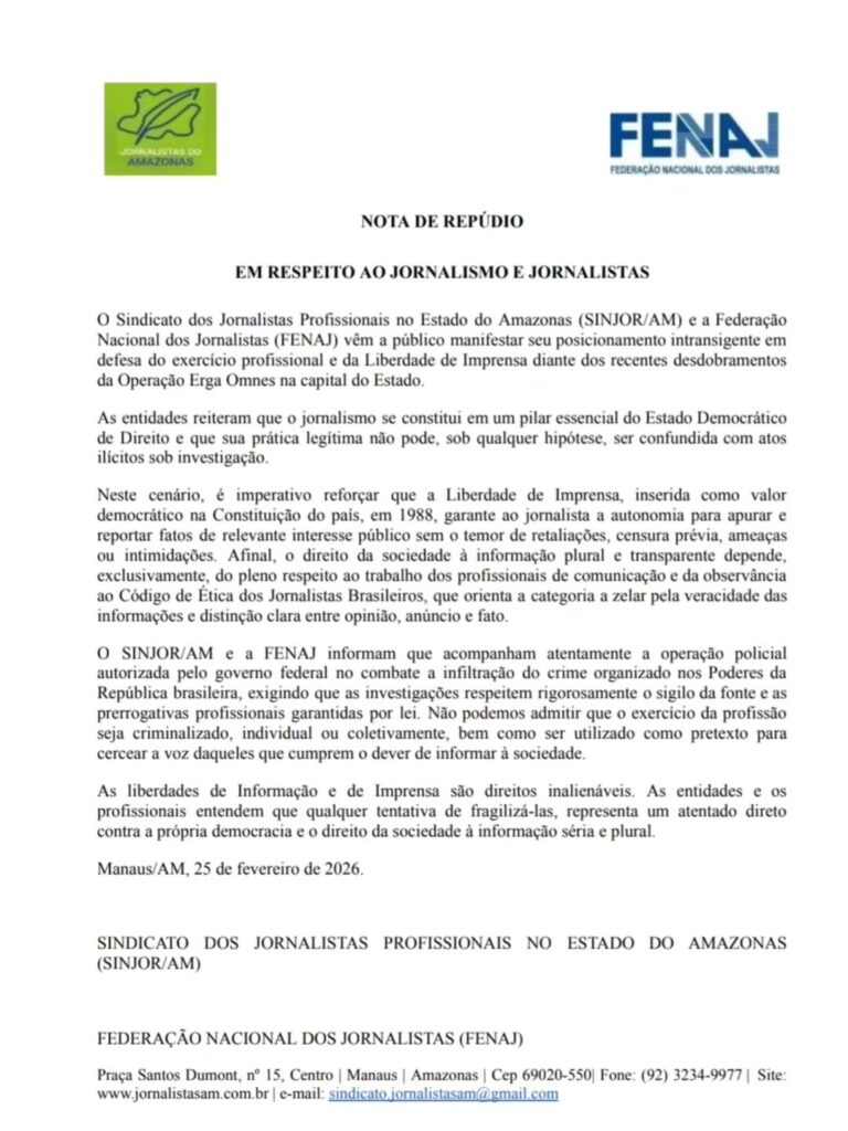 “Neste cenário, é imperativo reforçar que a Liberdade de Imprensa, inserida como valor democrático na Constituição do país, em 1988, garante ao jornalista a autonomia para apurar e reportar fatos de relevante interesse público, sem o temor de retaliações, censura prévia, ameaças ou intimidações. O direito da sociedade à informação plural e transparente depende, exclusivamente, do pleno respeito ao trabalho dos profissionais de comunicação”, diz trecho da nota.