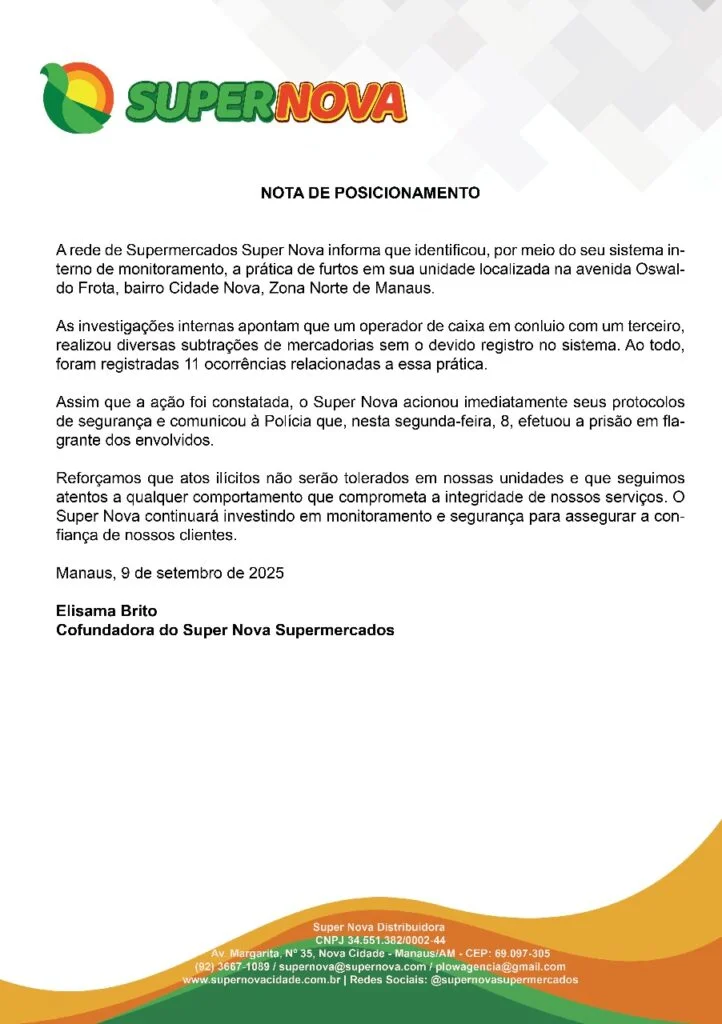 A cofundadora do Super Nova Supermercados, Elisama Brito, emitiu uma nota de posicionamento nesta segunda-feira, 9/9, após a prisão do funcionário Jhonatas Rodrigues Silva e de seu comparsa Altemar Gaspar Barros, suspeitos de envolvimento em furtos na unidade localizada no conjunto Oswaldo Frota, bairro Cidade Nova, zona Norte de Manaus.