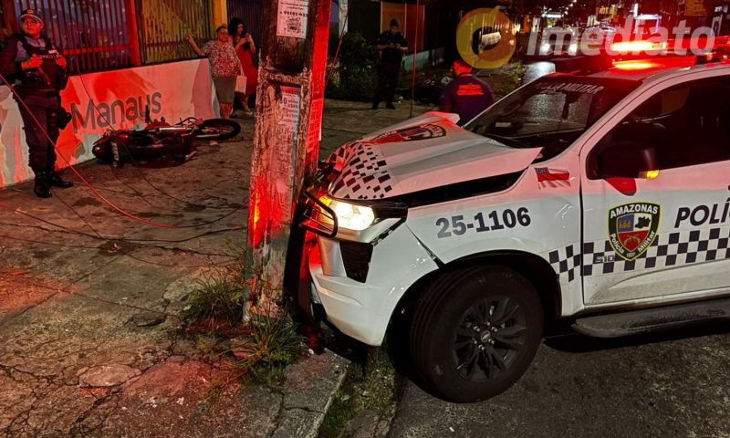 Uma viatura da Polícia Militar do Amazonas (PMAM) colidiu contra um poste de energia durante uma perseguição a um motociclista no bairro Alvorada, Zona Oeste de Manaus, na noite desta sexta-feira (4). O caso ocorreu na rua Professor Abílio Alencar, em frente à Escola Graziella Ribeiro, e mobilizou equipes do SAMU e da perícia criminal.